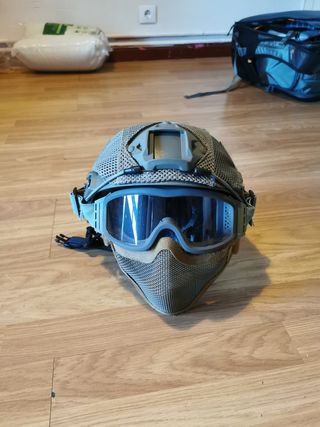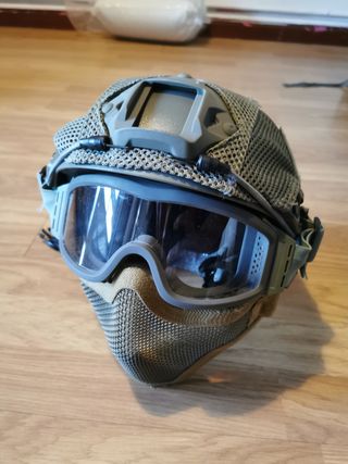 Vendo conjunto completo de protección para airsoft: casco tipo FAST + gafas + máscara de rejilla, todo en muy buen estado (usado solo 1 partida). ✅ Incluye: - Casco tipo FAST (estilo táctico) con funda/cubre-casco y velcros para parches. Lleva rails laterales y soporte frontal para accesorios. - Pouch/porta-batería (ideal para GoPro/batería/contrapeso). - Gafas tácticas (las de la foto) adaptadas para llevar con el casco y con sistema de liberación rápida (quick release). - Máscara de rejilla (protección facial) adaptada para anclar al casco con quick release. 🧵 Estado: prácticamente nuevo, sin roturas ni desperfectos (ver fotos).