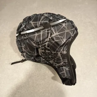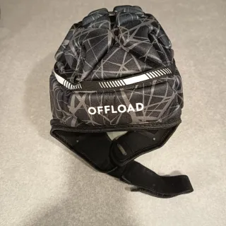 Casco de protección para rugby infantil con diseño moderno. - Color: Negro con estampado geométrico gris. - Marca: OFFLOAD. - Cierre ajustable con correas.
