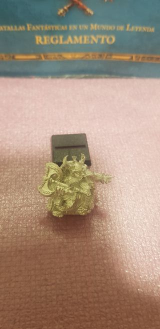 Figura de un héroe enano de Warhammer. Detallada y lista para pintar. - Hacha de guerra. - Armadura con detalles. - Casco con cuernos.