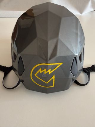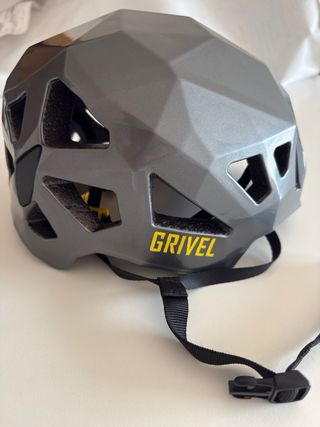 Casco de escalada o montaña de la marca Grivel. Diseño moderno y robusto. - Color gris metalizado. - Detalle de logo amarillo. - Correas de sujeción ajustables.