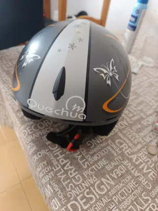Casco de esquí Quechua con diseño de mariposas y estrellas. Ideal para niñas. - Color gris con detalles en blanco y naranja. - Cierre de seguridad. - Marca: Quechua.