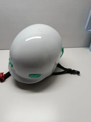 Casco blanco para esquí o snowboard, con detalles en color verde. - Diseño liso y brillante. - Correa de sujeción ajustable con cierre rápido rojo. - Ventilaciones laterales verdes.