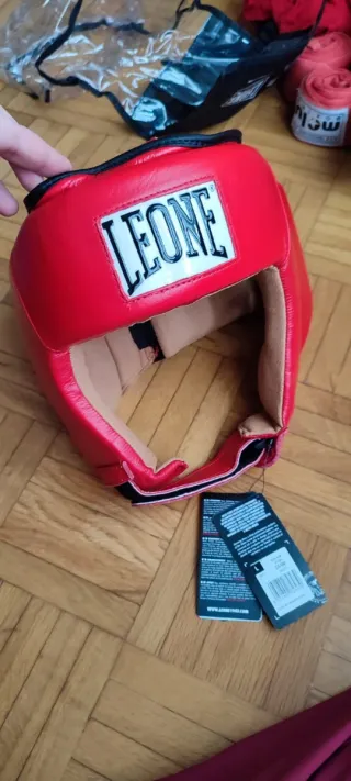 Casco de boxeo de la marca Leone en color rojo. Diseñado para proteger la cabeza durante el entrenamiento. - Material exterior de cuero. - Interior acolchado para mayor comodidad. - Cierre ajustable. - Logo de Leone en la parte frontal. Precio no negociable