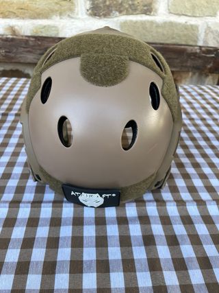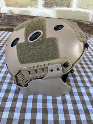 Casco táctico para airsoft en color beige. Está en buen estado, con algunas marcas de uso minimas. - Ideal para juegos de airsoft. - Incluye dos parches de velcro. - Diseño ligero y cómodo.