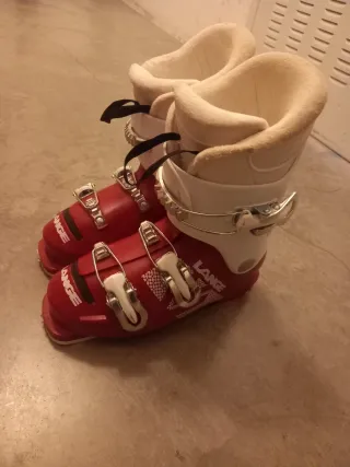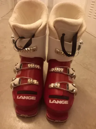 Botas de esquí de la marca Lange en color rojo. Talla 21.5 - Cierre con hebillas metálicas. - Interior forrado en tejido suave. - Diseño deportivo. Esquís Nórdica de 110 con fijaciones. Regalo casco con gafas y bastones.