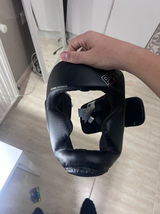 Casco de boxeo de la marca Decathlon, modelo Outshock. Diseñado para proteger la cabeza durante el entrenamiento. - Color negro. - Cierre ajustable. - Acolchado interior.
