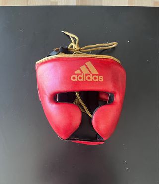 Casco de boxeo de la marca Adidas en color rojo. Diseñado para proteger la cabeza durante el entrenamiento. - Talla S - Cierre con cordones. - Logo de Adidas en dorado.