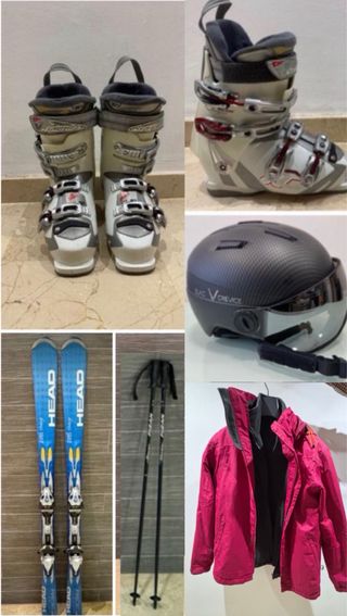 Conjunto completo de equipamiento para esquiar. Tienes foto y precio de cada artículo por separado de en mi perfil. Vendo por separado o todo el kit junto. - Botas de esquí blancas t 24.0 - Casco de esquí negro con visera (Gafas) S/M - Esquís azules marca HEAD 149 cm - Bastones de esquí. - Chaqueta de dos piezas con forro polar interior.