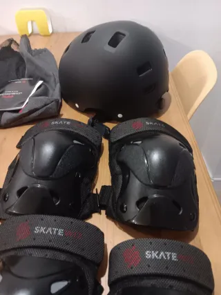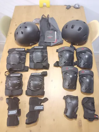 Set de protecciones para skate, patinaje o ciclismo. - Dos cascos negros. - Juego de rodilleras y coderas. - Muñequeras.talla casco L y M juego protecciones talla L un juego de protecciones esta nuevo sin usar y el otro usado
