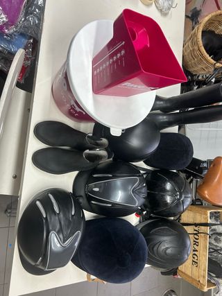 Conjunto de artículos para equitación. - Dos cascos de equitación negros. - Un casco azul marino. - Un casco negro con detalles plateados. - Un casco negro con rejilla plateada. - Un par de botas de equitación negras. - Un cubo rosa con medidor. Se vende todo junto.