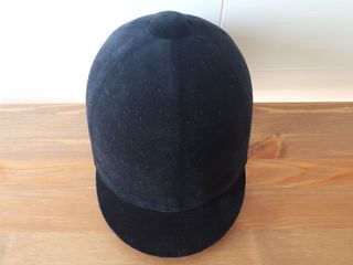 Casco de hípica negro. Diseño clásico y elegante. Material exterior de terciopelo. Interior forrado en tela. Con visera. Talla 7 y 1/2. Nuevo. Sin usar.