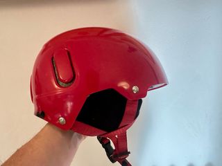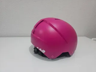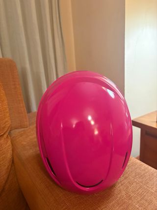 Casco de esquí de color rojo frambuesa, diseñado para la seguridad en la nieve. - Exterior liso y resistente. - Acolchado interior para mayor comodidad. - Correa ajustable con cierre de seguridad. - Como nuevo, pero con algún pequeño arañazo.