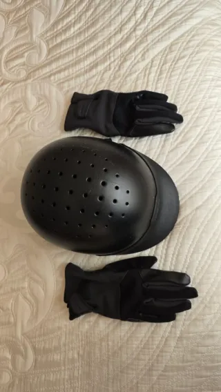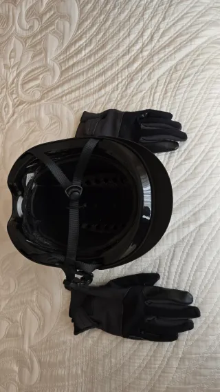 Conjunto de casco y guantes para equitación. - Casco negro con ventilación. - Guantes negros.