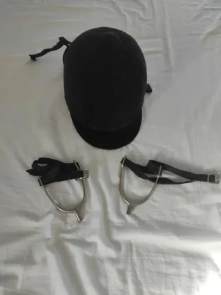 Conjunto de equitación que incluye un casco y un par de espuelas. - Casco de equitación negro. - Espuelas metálicas con correas negras.