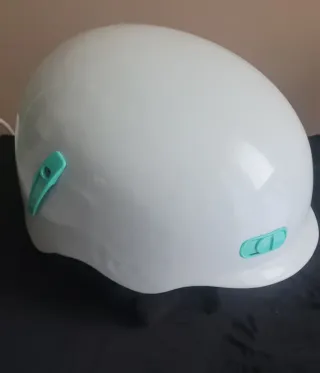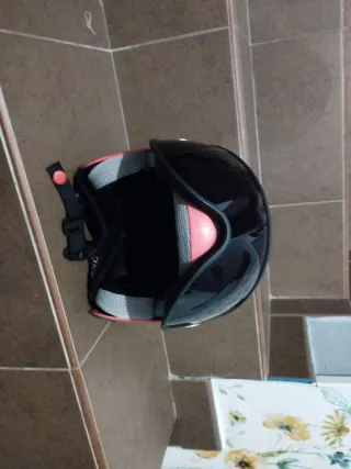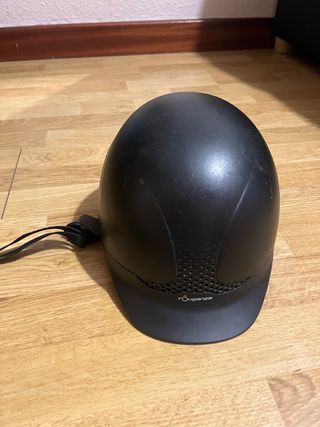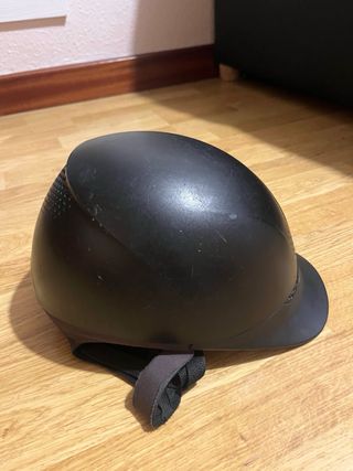 Casco de equitación negro correas ajustables y ruleta en la parte trasera que se adapta a la cabeza del jinete o amazona. - Diseño clásico y seguro. - Talla ajustable para mayor comodidad. Está usado y se nota en la pintura saltada en la visera sobre todo. Pero está perfectamente conservado y es 100% utilizable.