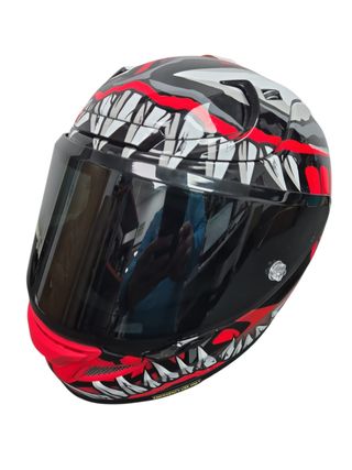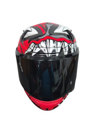 Casco de moto HJC con diseño inspirado en Marvel. - Diseño llamativo con temática de Venom. - Visera oscura. - Detalles en rojo y gris.