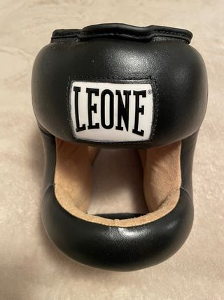 Casco de boxeo Leone CS425 con protección frontal. Diseñado para ofrecer seguridad durante el entrenamiento. Talla L - Material exterior de cuero negro. - Interior de cuero natural. - Logo de Leone en la parte frontal.