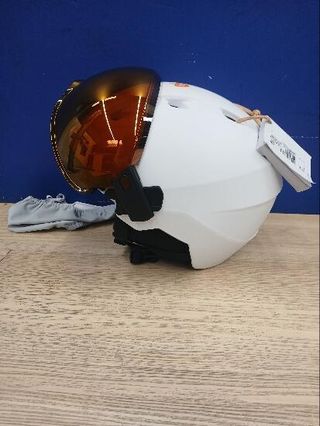 Casco de esquí en color blanco, talla M, con visera integrada. - Visera con acabado espejado. - Diseño con ventilación. - Cierre ajustable.