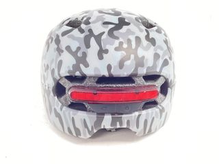 Casco de bicicleta con diseño llamativo en blanco, rojo y gris. - Diseño con ventilaciones. - Detalles gráficos en rojo y gris.