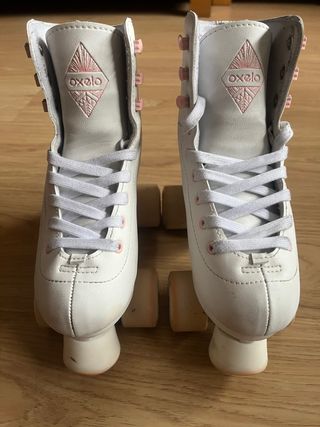 Patines Oxelo de cuatro ruedas, talla 33. Están en buen estado, con algunos signos normales de uso. - Color blanco con detalles rosa. - Ideales para principiantes.