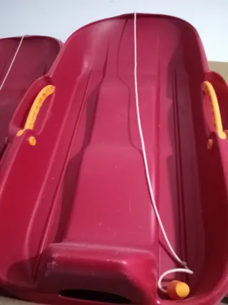Trineo de plástico rojo con asas laterales y cuerda para arrastrar. - Color rojo intenso. - Asas de plástico amarillo. - Cuerda blanca con tirador naranja. Se puede llevar hasta Zaragoza