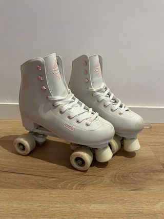Patines artísticos Risport, talla 220 (equivalente a núm. 35) . Están en buen estado, aunque muestran señales normales de uso. Ideales para empezar o para nivel inicial/intermedio. Incluyen hojas montadas. Listos para utilizar. - Marca: Risport - Talla: 220 - Color: Blanco