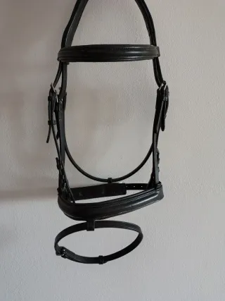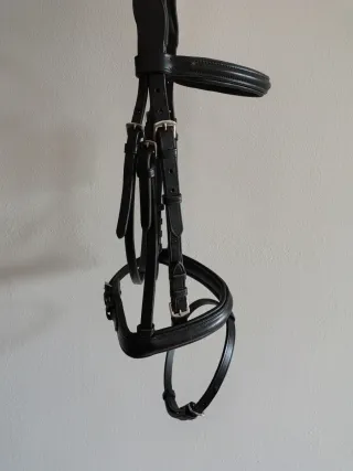 Cabezada o brida de cuero negro, tamaño cob (pony o caballo pequeño). Muy poco uso. No incluye riendas. Lleva cierrabocas y puede enviarse con un filete oliva de 12.5 (a petición - ver última foto). Testera anatómica para mayor comodidad del caballo. Una sola tira ancha, acolchada y que deja espacio para la base de las orejas. La muserola y la frontalera también están acolchadas. Sin piezas oxidadas.