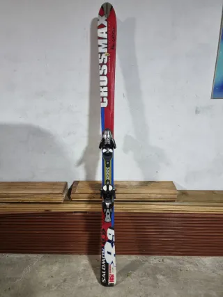 Esquís Salomon Crossmax de 165cm con fijaciones. - Diseño deportivo en rojo, azul y blanco. - Marca Salomon. - Modelo Crossmax. - Longitud 165cm.