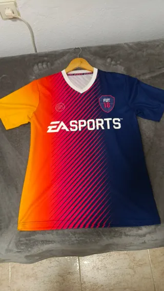 Camiseta exclusiva de la temática FIFA 18 de EA Sports. Ya no se puede comprar en ningún sitio, está poco usada y en buenas condiciones. - Diseño bicolor: naranja y azul marino. - Estampado de líneas diagonales en rojo y azul. - Logo de EA Sports en blanco. - Escudo de FUT 18 en el pecho.