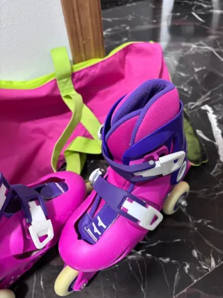 Patines en línea evolutivos (talla de la 34 a la 36) Oxelo de Decathlon en color rosa y morado, ideales para iniciarse en el patinaje. Con marcas de uso pero todavía tiene vida por delante. En buen estado general. Se entrega con bolsa de transporte con ventilación.