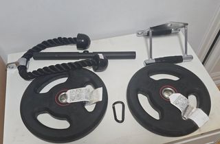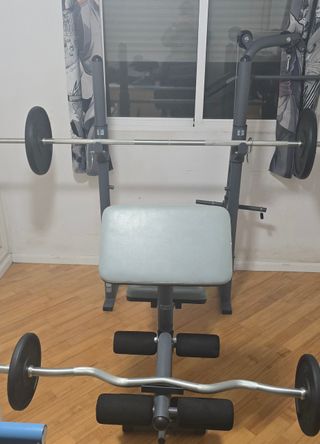 Equipo de gimnasio para entrenar en casa, el banco esta perfecto ningun corte ni cuarteado. - Distintos agarres - Esterilla - Banco de musculación. - Discos de pesas 2 de 20 2 de 10 y 2 de 5kg - Barras para ejercicios en z y recta de 1.90