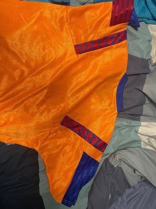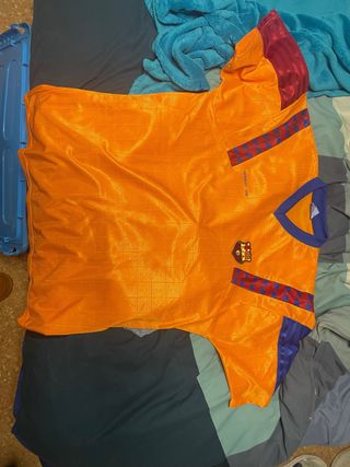 Camiseta de colección del FC Barcelona, conmemorativa de la final de la Copa de Europa en Wembley 1992. Un diseño retro que evoca la historia del club. Gente seria - Color naranja vibrante. - Detalles en azul y granate en mangas y cuello. - Escudo del club bordado en el pecho.