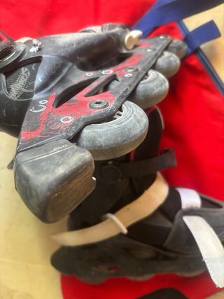 Patines en línea de color azul, ideales para iniciarse en el patinaje. Son ajustables para adaptarse al crecimiento. - Color azul con detalles en rojo y blanco. - Cierre de velcro y hebilla. - Ruedas con diseño. - Talla ajustable 28-30.