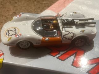 Coche de slot a escala 1/24, modelo Lotus. - Diseño deportivo en blanco y naranja. - Detalles de patrocinadores y número 23.