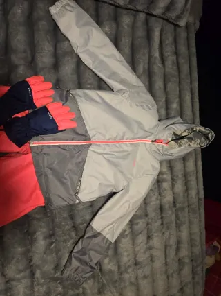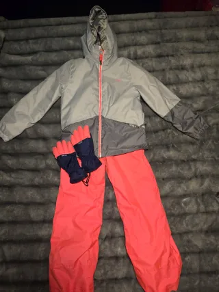 Conjunto de esquí para niños, ideal para disfrutar de la nieve con comodidad y estilo. - Chaqueta gris y azul con cremallera rosa. - Pantalones de color coral. (manchadas por la telesilla !!! ) - Guantes azul marino con detalles en coral.