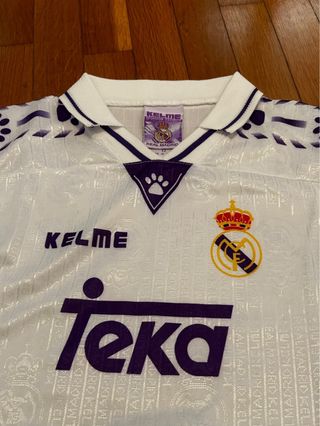 Camiseta de fútbol del Real Madrid para niños. - Talla 12 años. - Diseño blanco con detalles en morado. - Logo de Kelme y escudo del club. - Logo LFP - Patrocinador Teka.