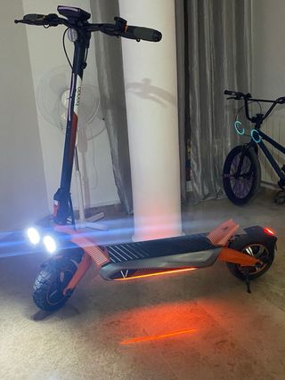 Patinete eléctrico Cecotec Bongo V70 con un llamativo diseño en color naranja. Ideal para desplazamientos urbanos. - Diseño deportivo en naranja y negro. - Plataforma antideslizante. - Ruedas de 8.5 pulgadas. - Luces LED frontales y traseras. Con cargador y casco talla M