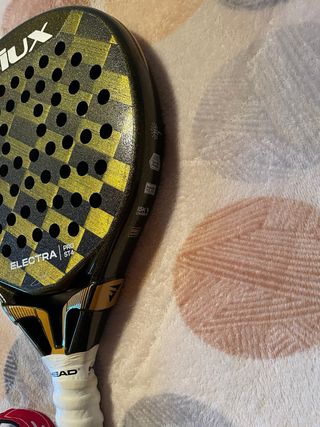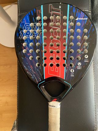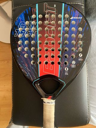 Pala de pádel Babolat con un diseño moderno y llamativo. - Pala de pádel Babolat. - Diseño con detalles en azul y rojo. - Agarre confortable. Como se observa en una foto hay dos picadas que no afectan a la pala