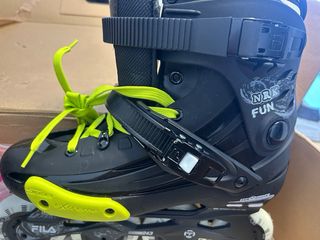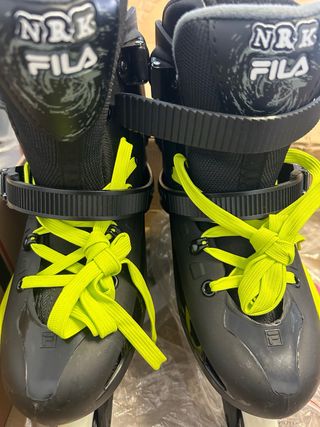 Patines en línea Fila NRK en color negro con cordones llamativos. - Diseño moderno con detalles en gris. - Cierre de velcro y hebilla. - Marca Fila visible en el patín.