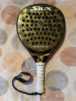 Pala de pádel Siux Electra Pro ST4 con un diseño llamativo. - Acabado en negro y dorado con patrón a cuadros. - Logo de Siux en blanco en la cara. - Nombre del modelo 'ELECTRA PRO ST4' visible. - Empuñadura blanca de la marca Head. - Correa de seguridad negra y rosa.