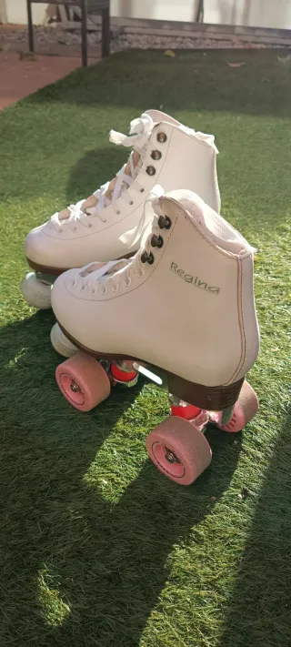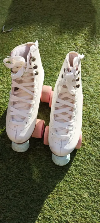 Patines artísticos de color blanco, talla 34. Ideales para iniciarse en el patinaje. - Bota alta (dura) para mayor sujeción. - Plancha de aluminio puede or con botas del número 34 al 37. - Cordones blancos. - Ruedas rosas. Estan en muy buen estado. Se han utilizado poco tiempo un siempre con fundas.