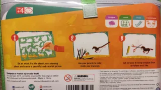 Kit de manualidades para niños con plantillas de dibujo. - 13 plantillas reutilizables. - lápices de colores usados en buenas condiciones. - Más de 260 formas para dibujar.