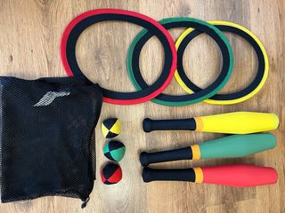Set de malabares completo, ideal para iniciarse o para quienes ya practican. Incluye todo lo necesario para empezar a jugar. - Tres mazas de colores (rojo, verde, amarillo). - Tres aros de colores (rojo, verde, amarillo). - Tres pelotas de malabares. - Bolsa de red para transporte.