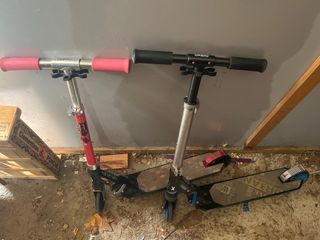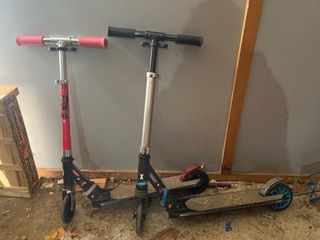Se venden dos patinetes infantiles, uno rojo y otro plateado. Ideales para que los niños se diviertan. - Patinete rojo con ruedas negras y puños rosas. - Patinete plateado con ruedas azules y puños negros. - Plataformas de patinaje. - Manillares ajustables. 5e cada uno!