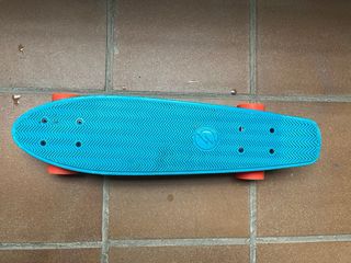 Penny board de color azul con ruedas naranjas. - Diseño clásico de penny board. - Superficie antideslizante.