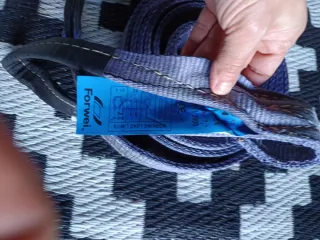 Eslinga de arrastre de color morado. Es ultra resistente y está enrollada. - Material textil. - Con argollas en los extremos.