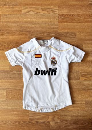 Camiseta Real Madrid bwin – Niño pequeño Camiseta del Real Madrid Medidas: largo 47 cm aproximadamente y ancho de pecho 34 cm aproximadamente. Etiqueta interior desgastada (como se aprecia en la foto)