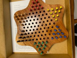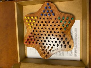 Juego de mesa clásico de Damas Chinas, fabricado en madera. - Tablero de madera con diseño de estrella. - Incluye fichas de varios colores (rojo, amarillo, azul, verde, marrón y negro). - Ideal para 2 a 6 jugadores.