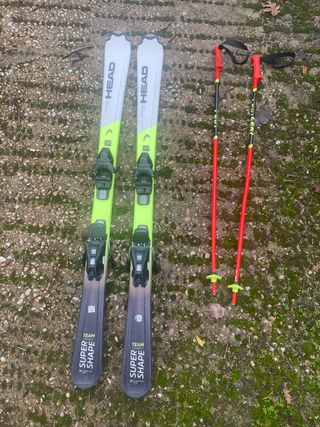 Conjunto de esquí infantil Head T137, ideal para los más pequeños. - Esquís Head T137. - Bastones de esquí rojos Leki T100. - Fijaciones de esquí 4SY Grip Walk. - Botas Head T240-245. Usado pocas veces, en muy buen estado.