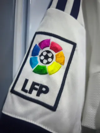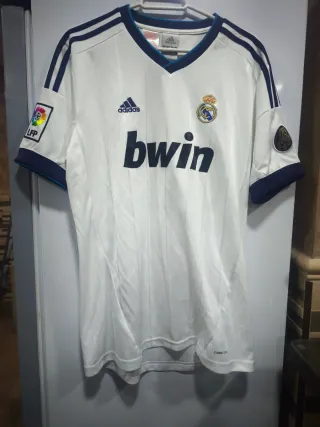 Camiseta de fútbol del Real Madrid de la temporada 2012/2013. - Diseño oficial Adidas. - Logo de la LFP en la manga. - Patrocinador principal Bwin. El logo bwin no está perfecto, aunque no se aprecia mucho